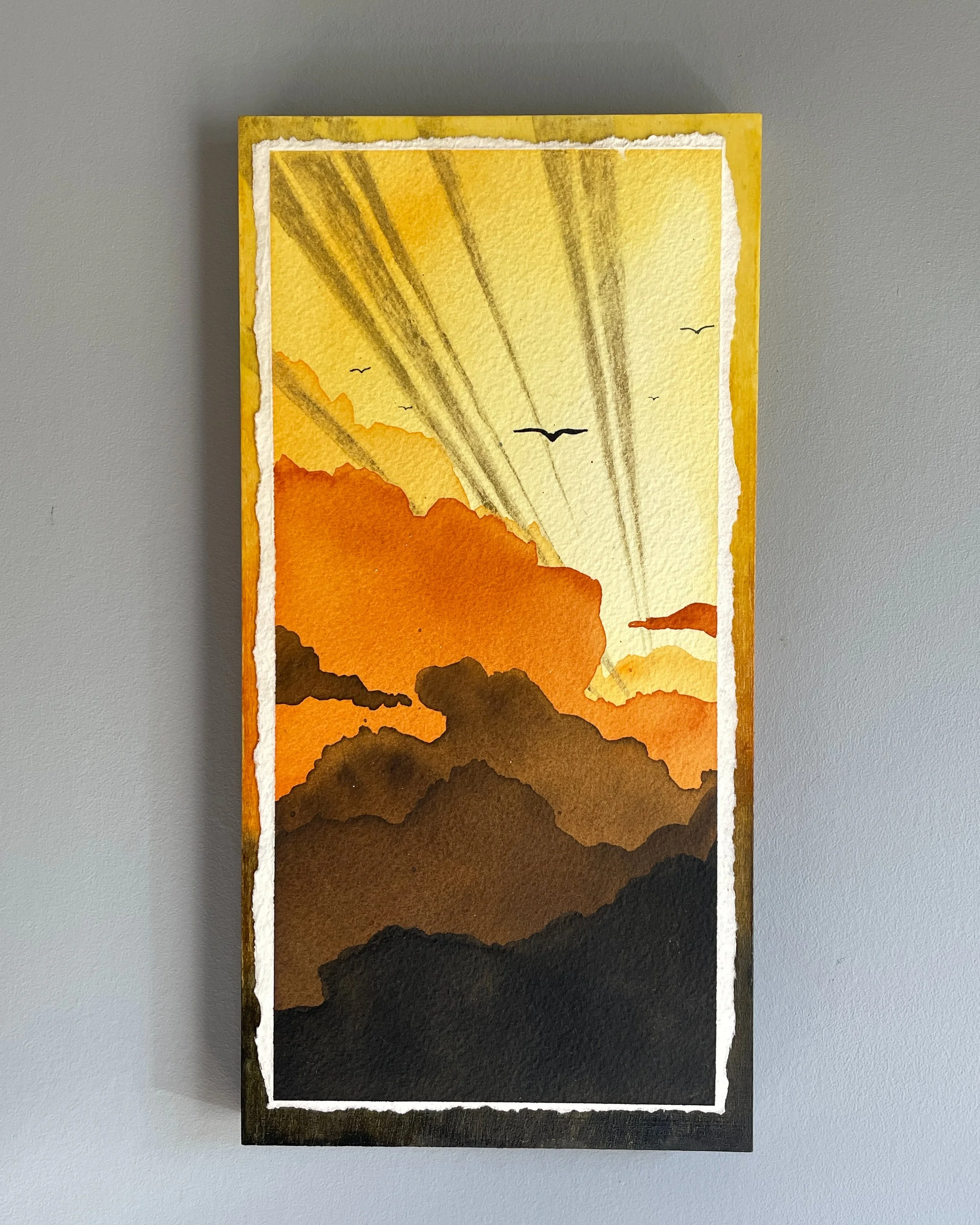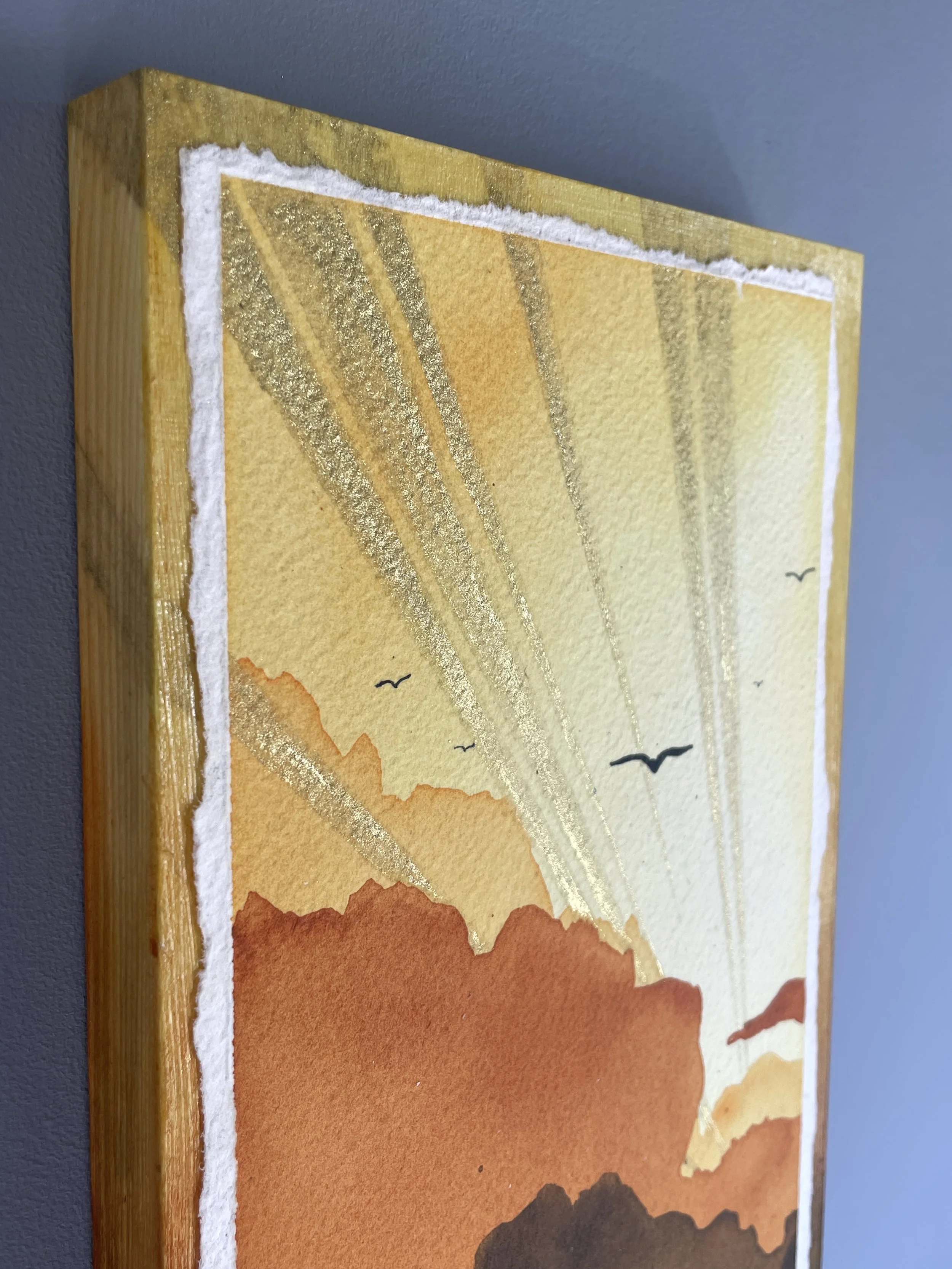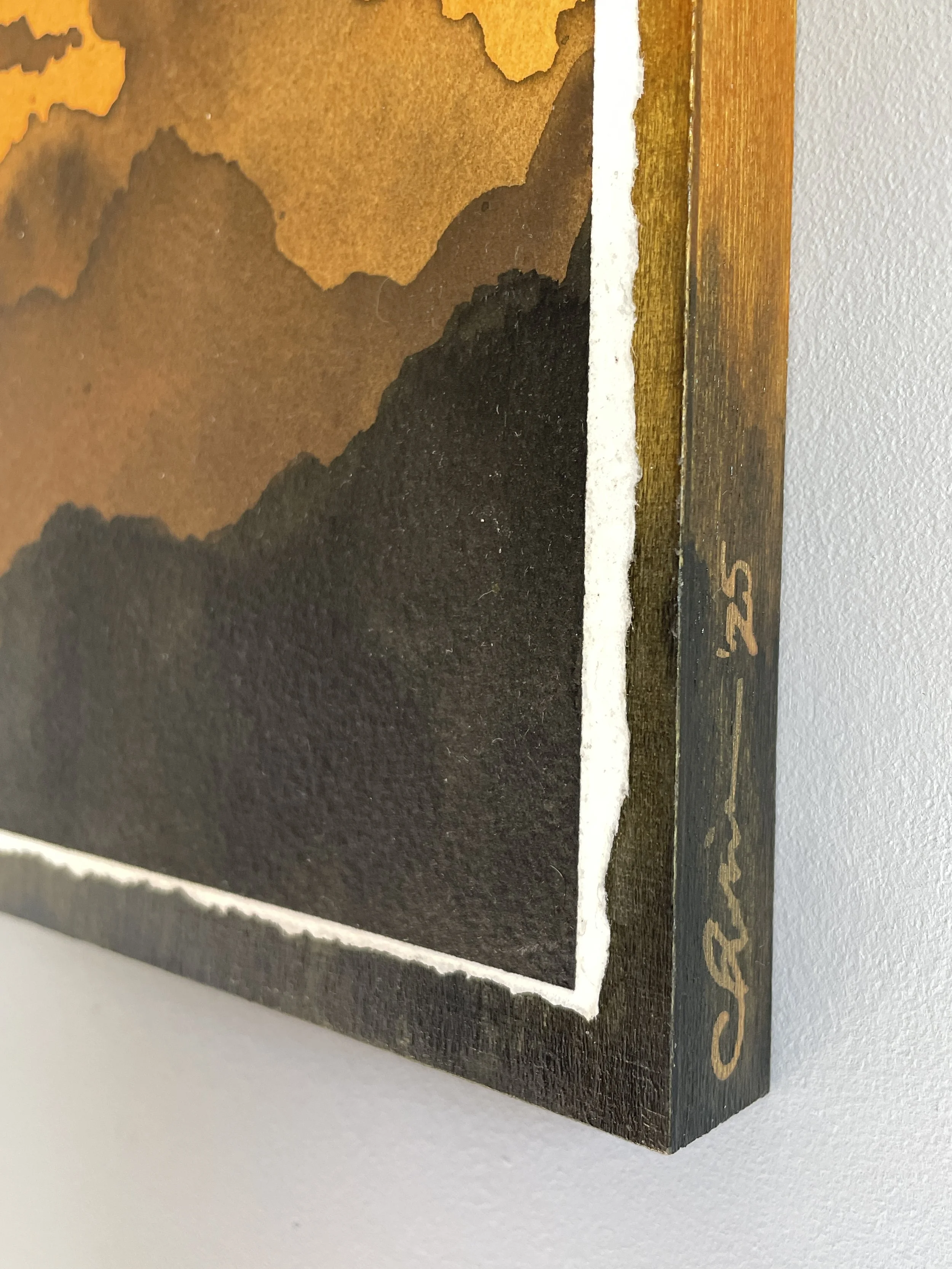 Watercolor, ink, and thread on paper under a unique walnut mat embossed with gold leaf. Mounted on a cradled birch panel. 9×12”