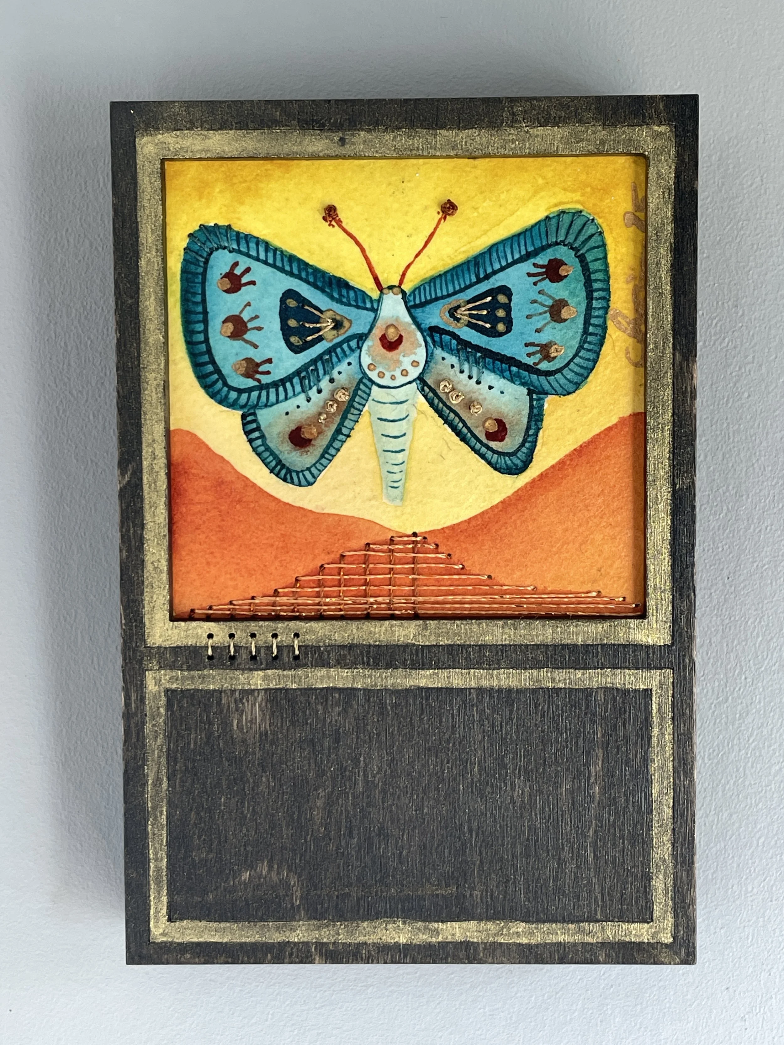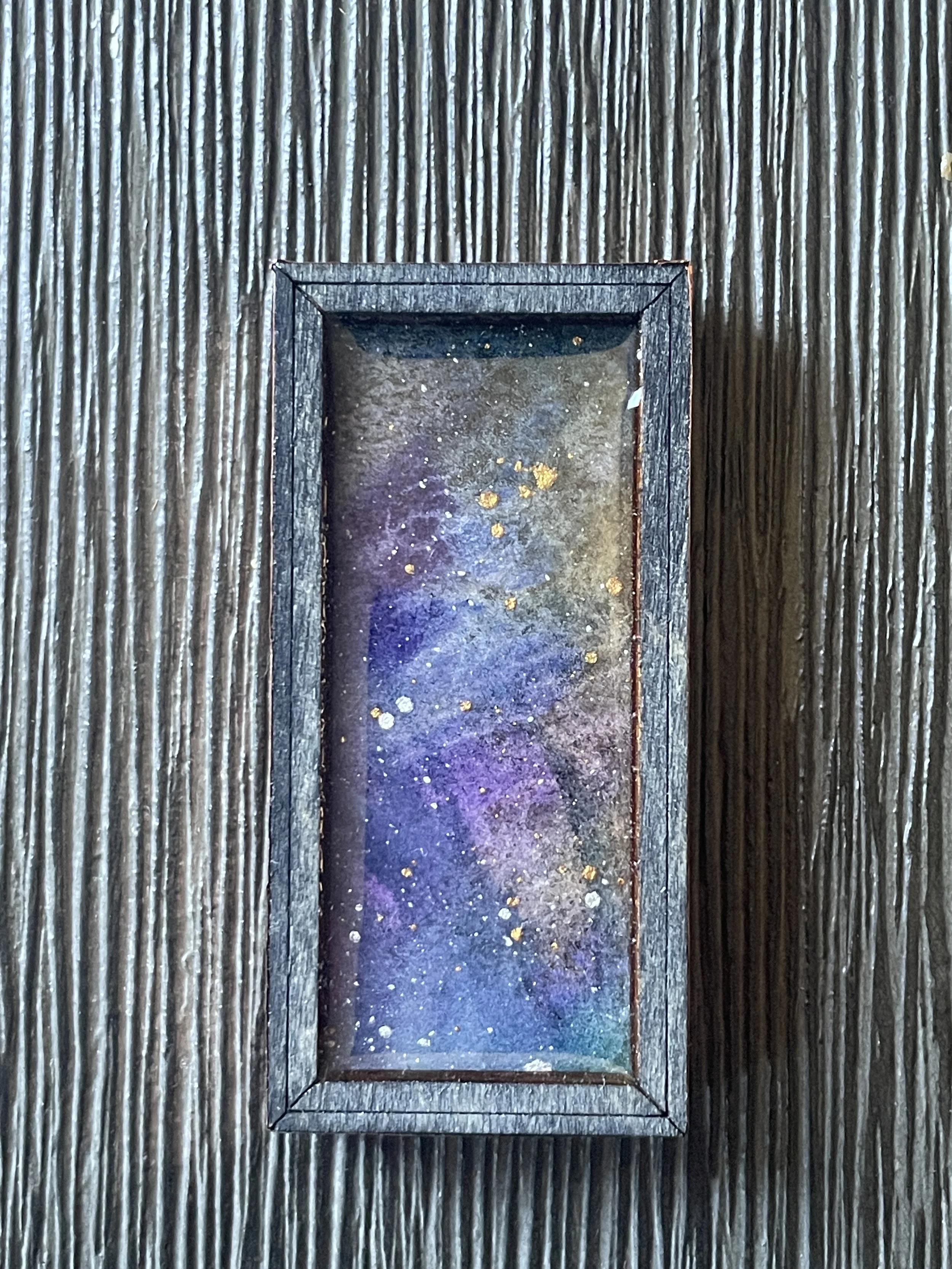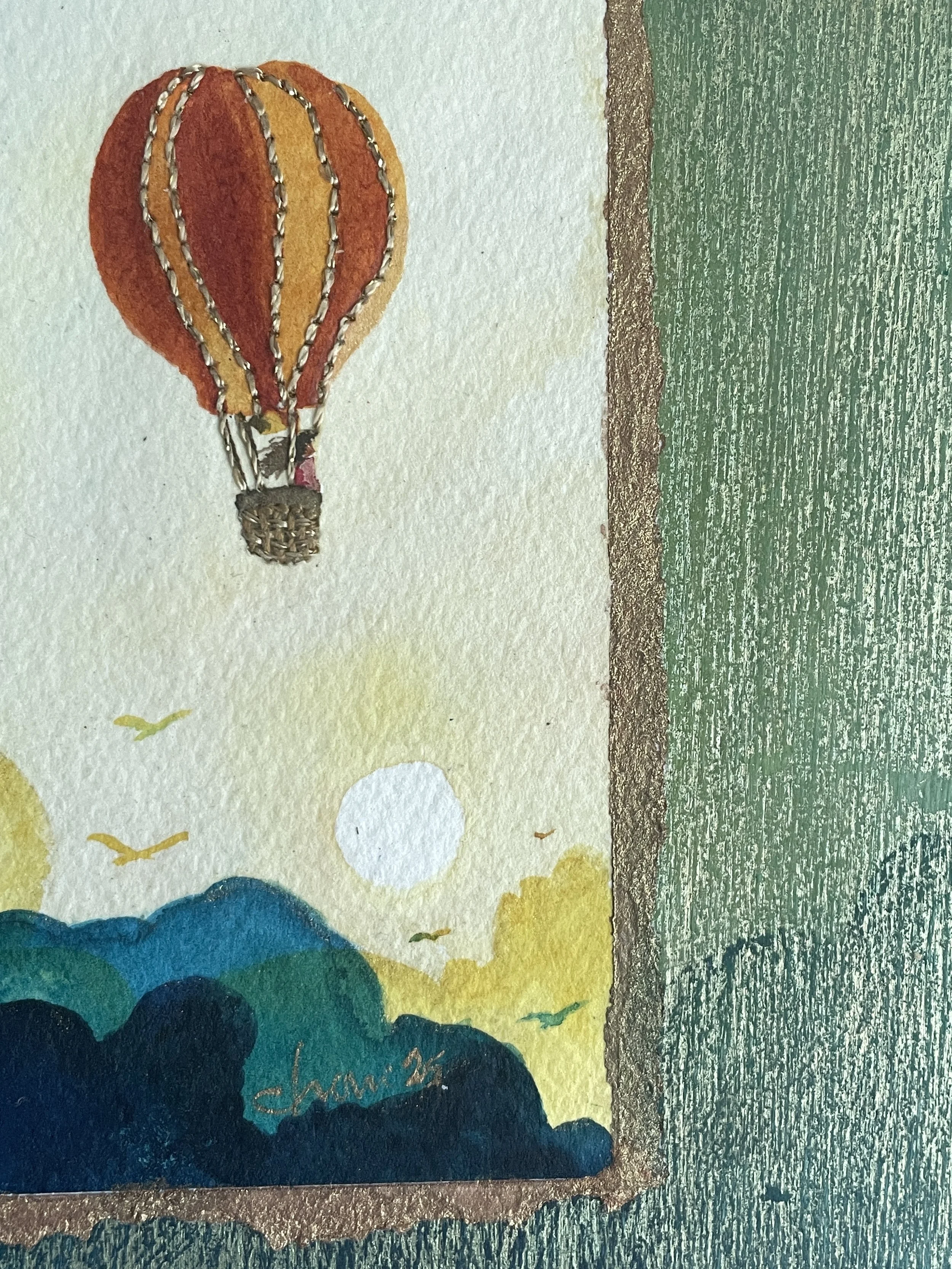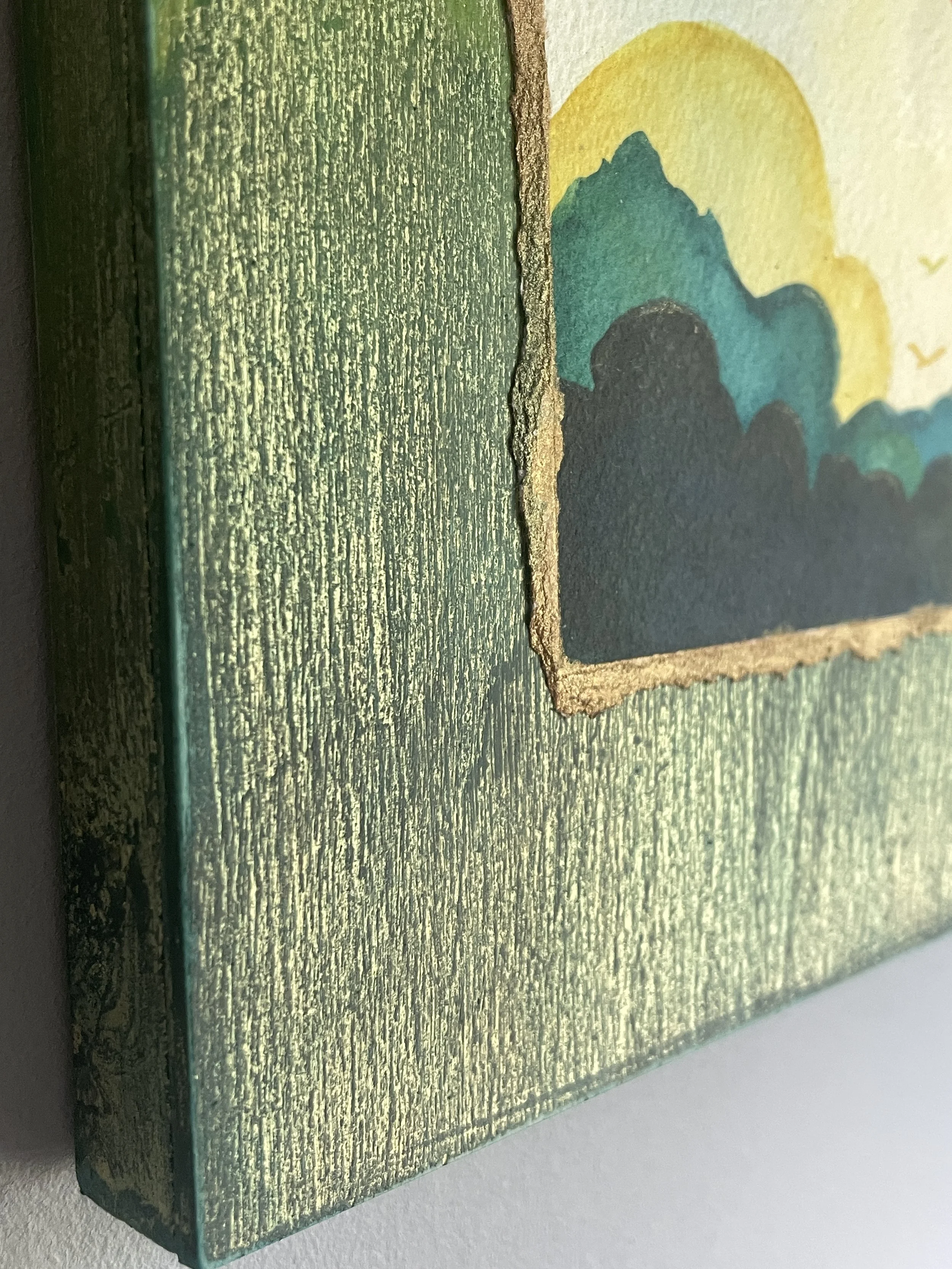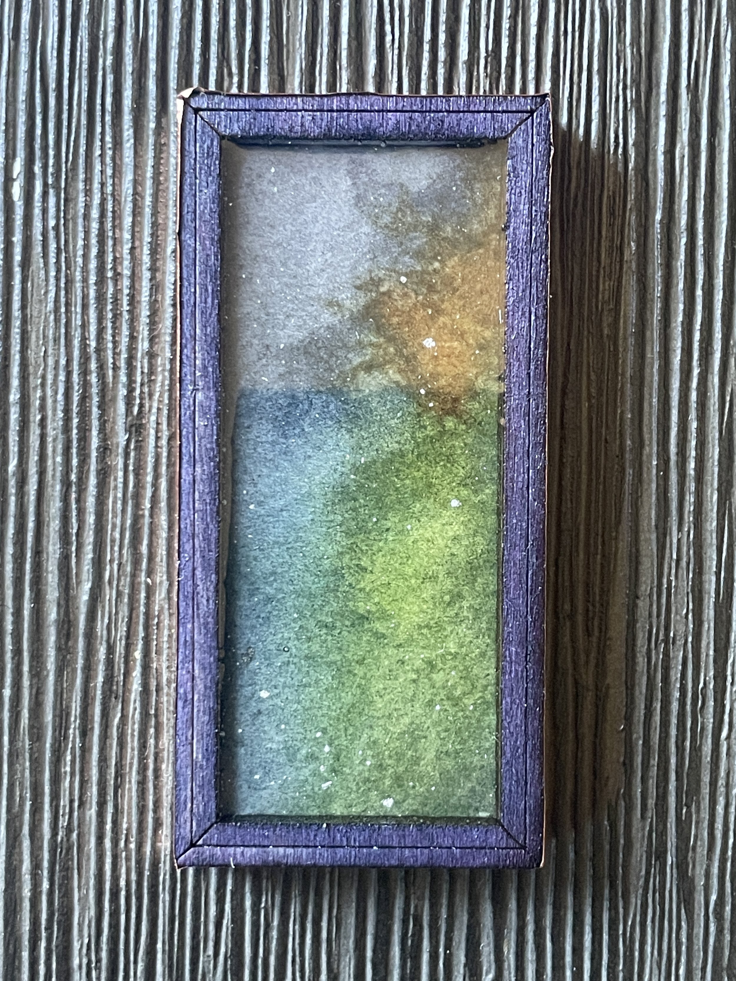Birds soar through amber clouds and golden sun rays. Watercolor on paper and birch panel. 6×12”