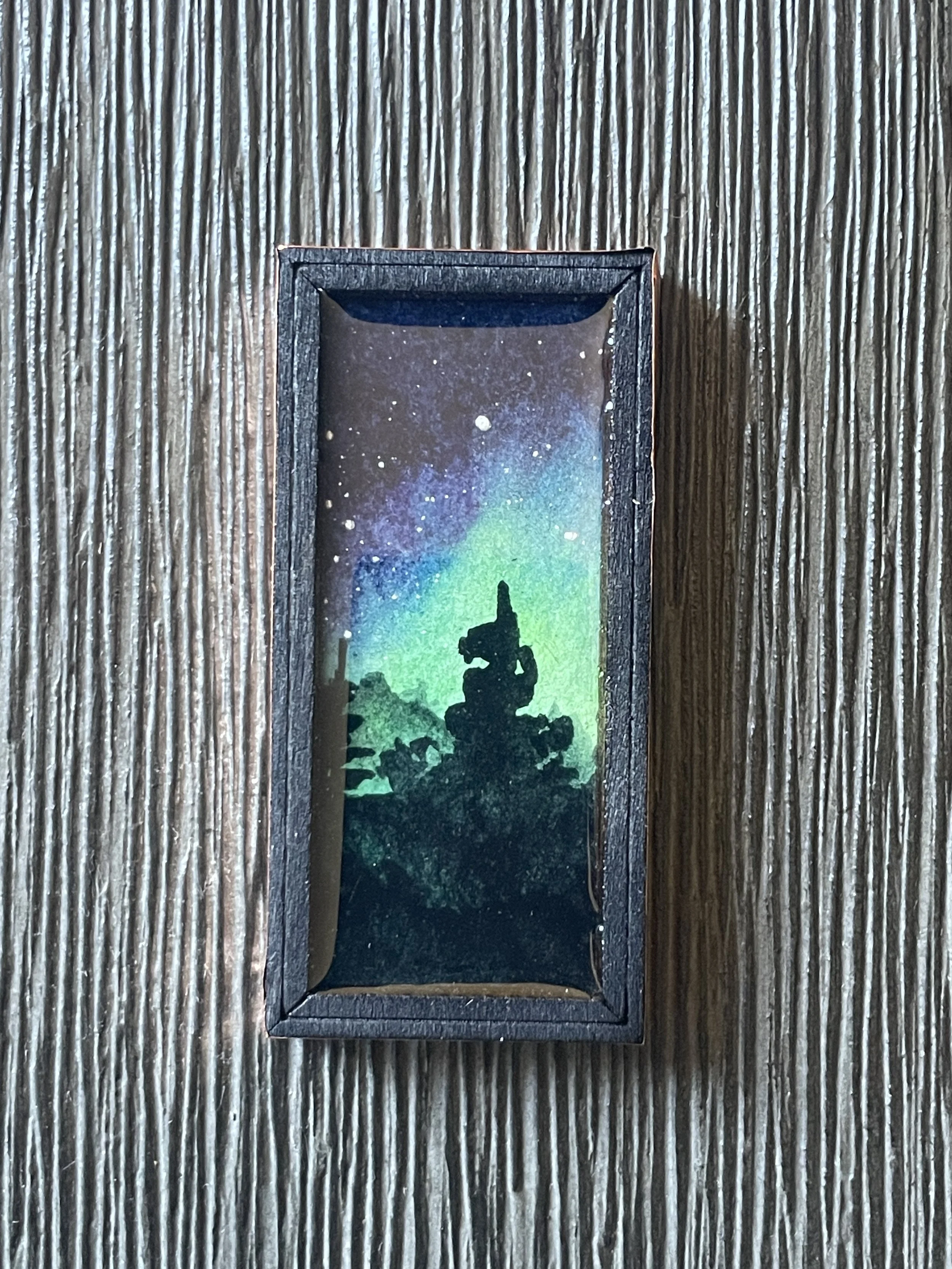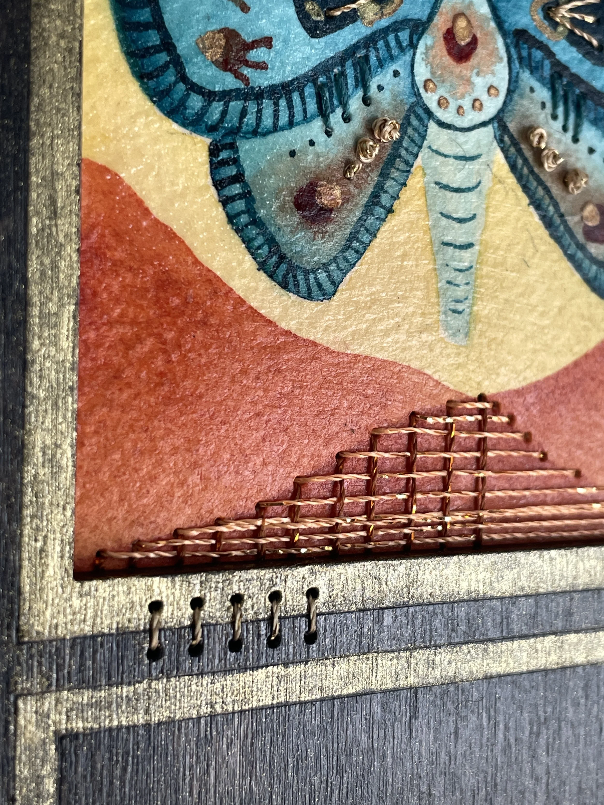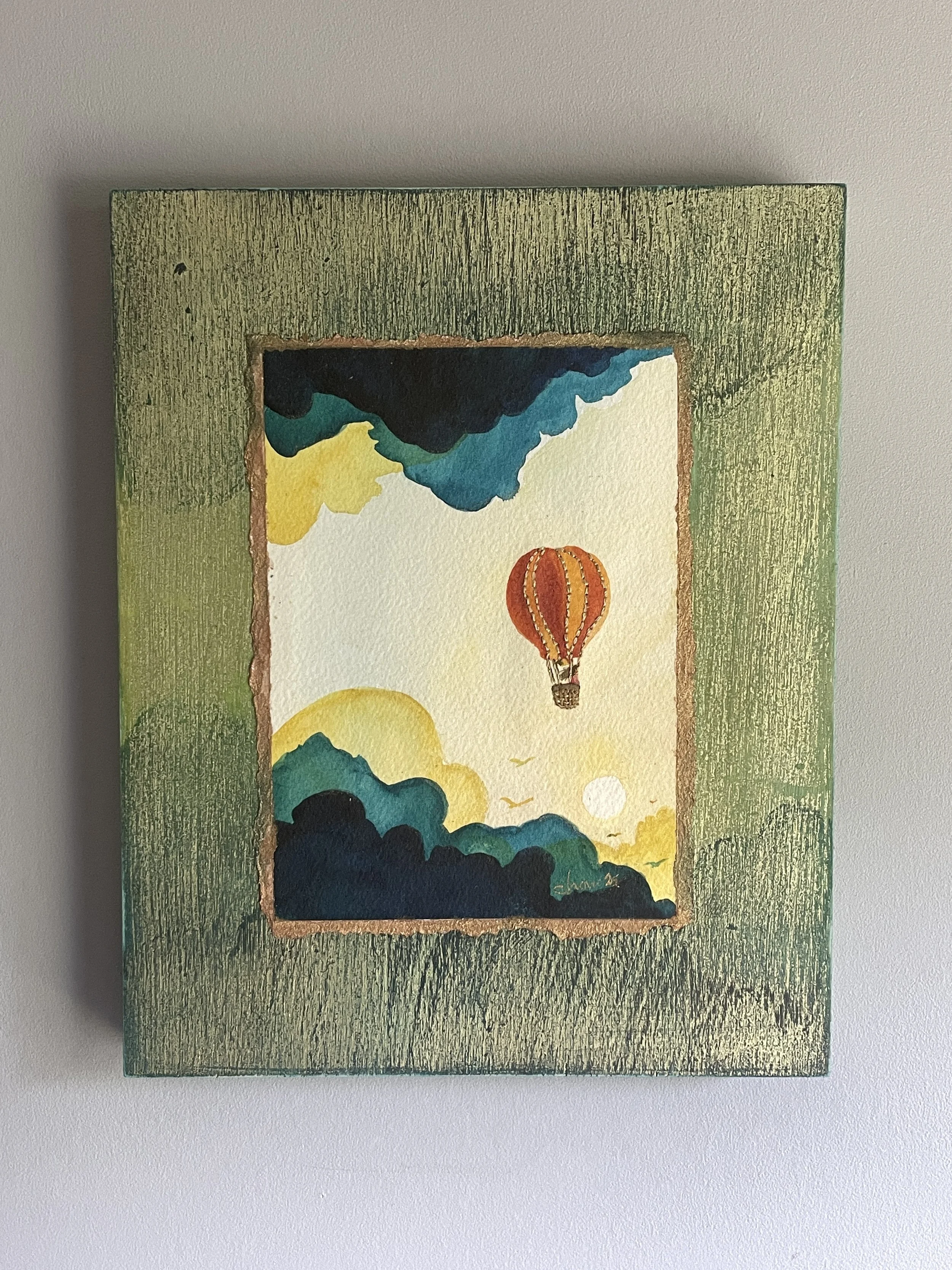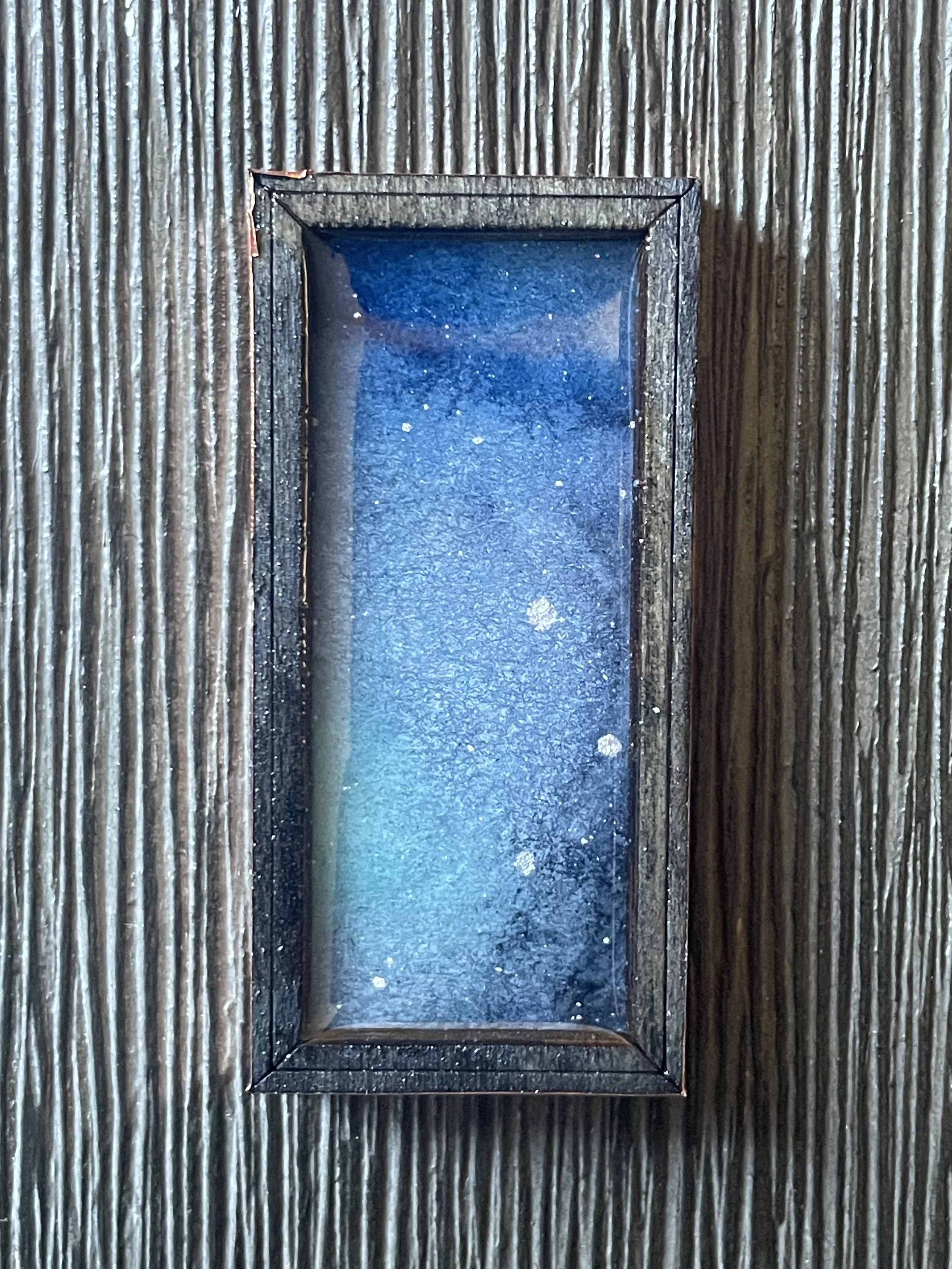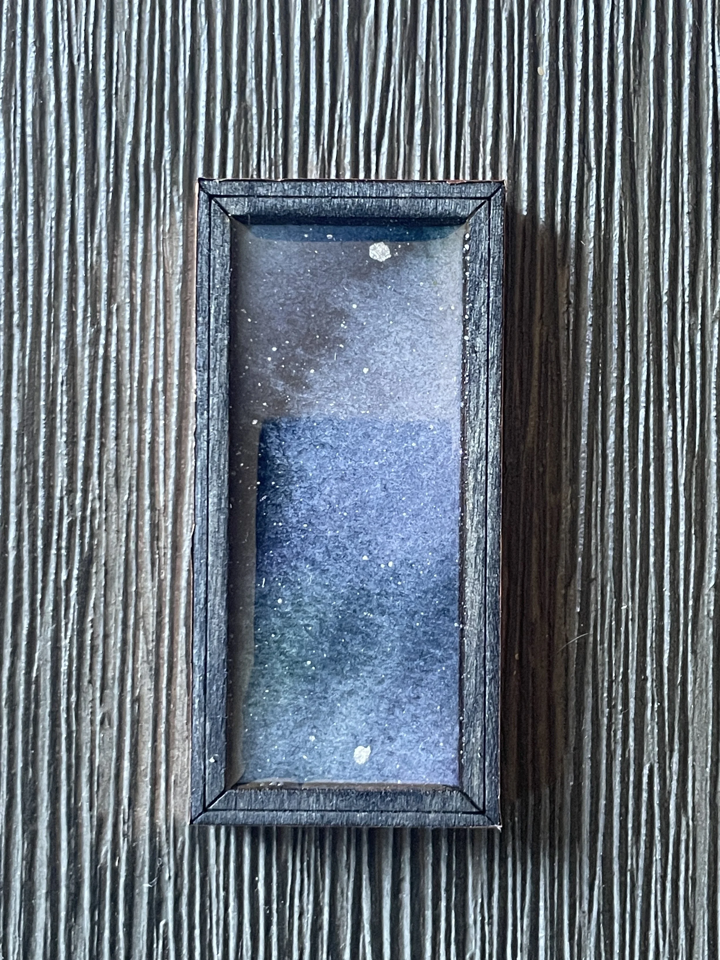 Birds soar through amber clouds and golden sun rays. Watercolor on paper and birch panel. 6×12”