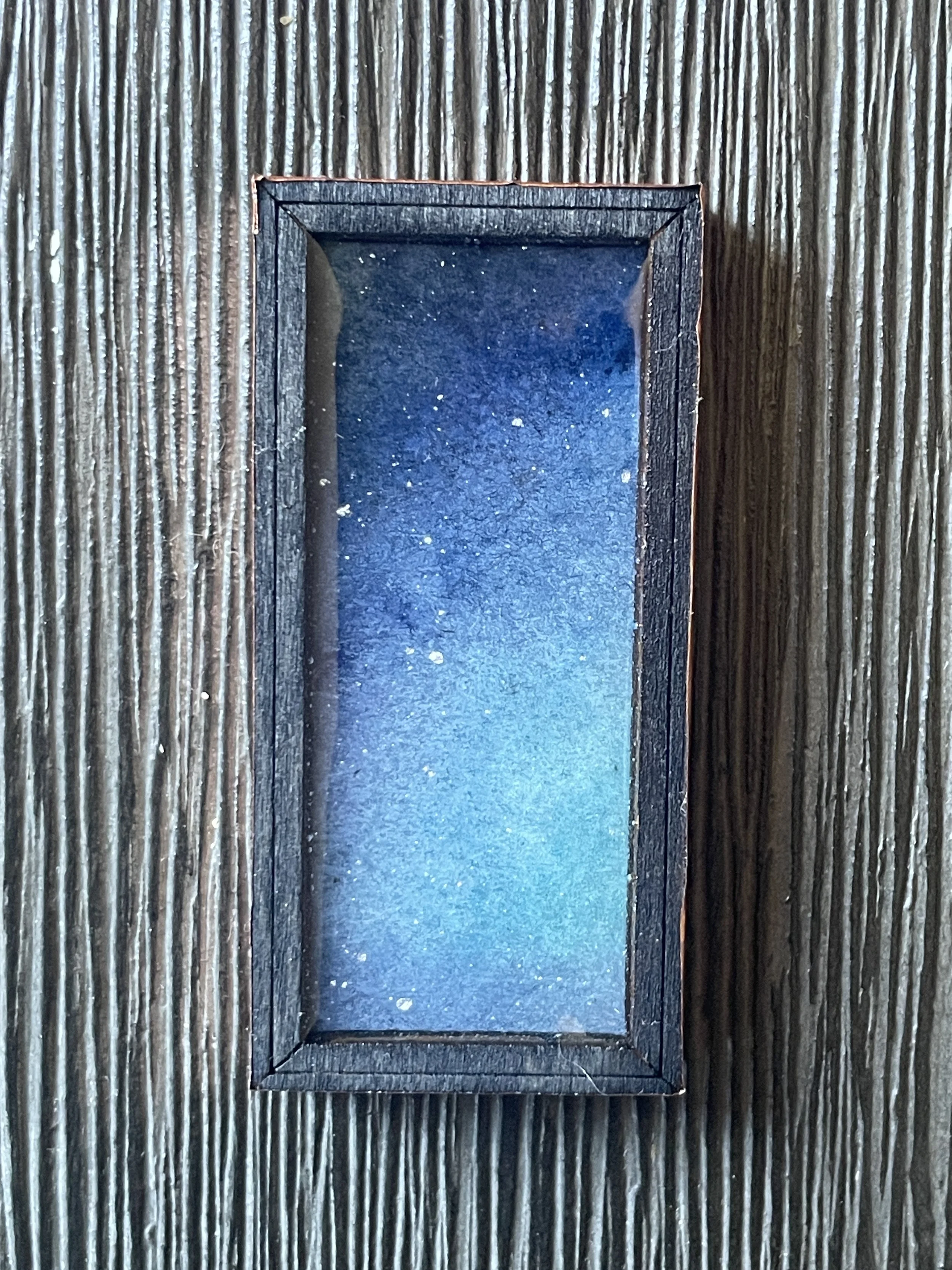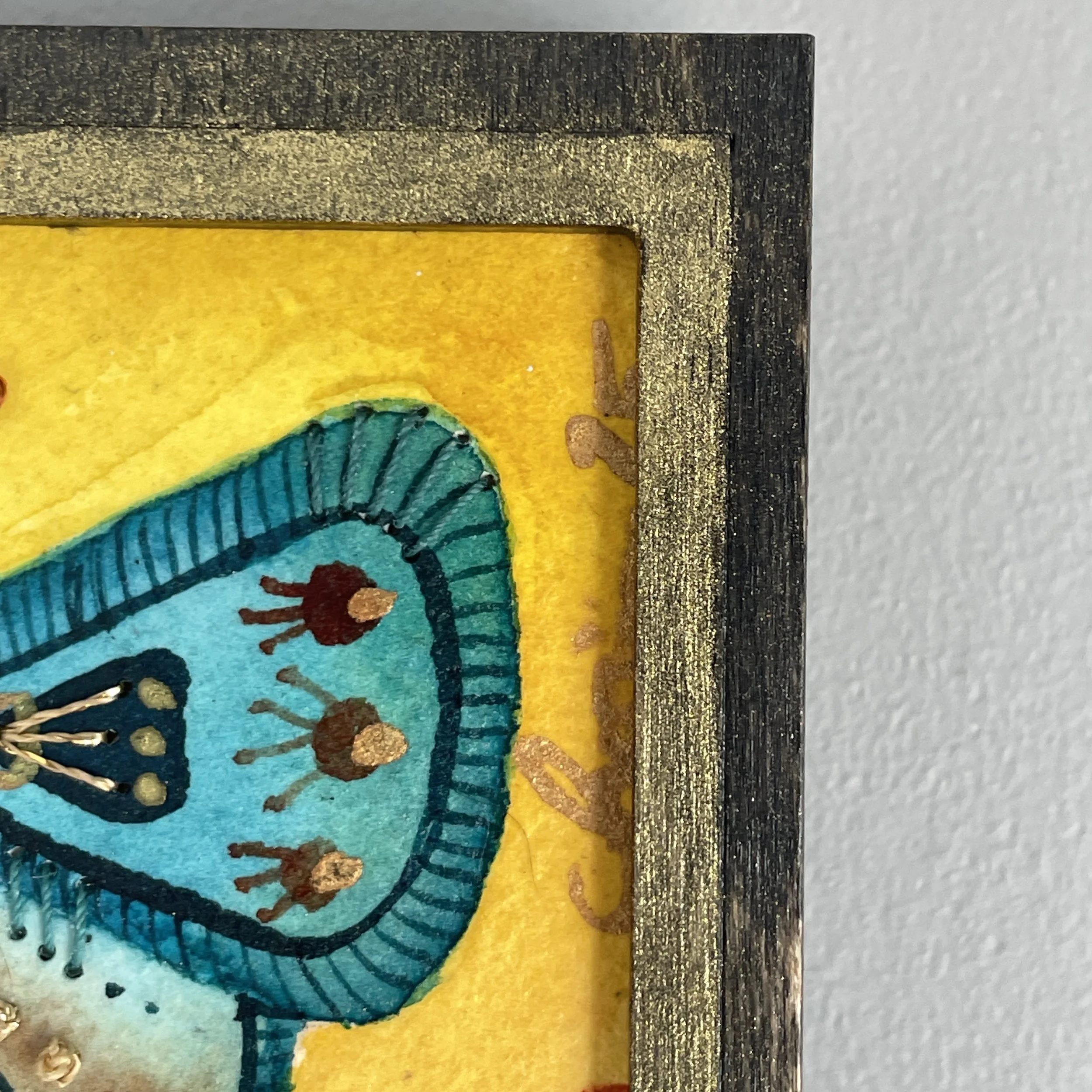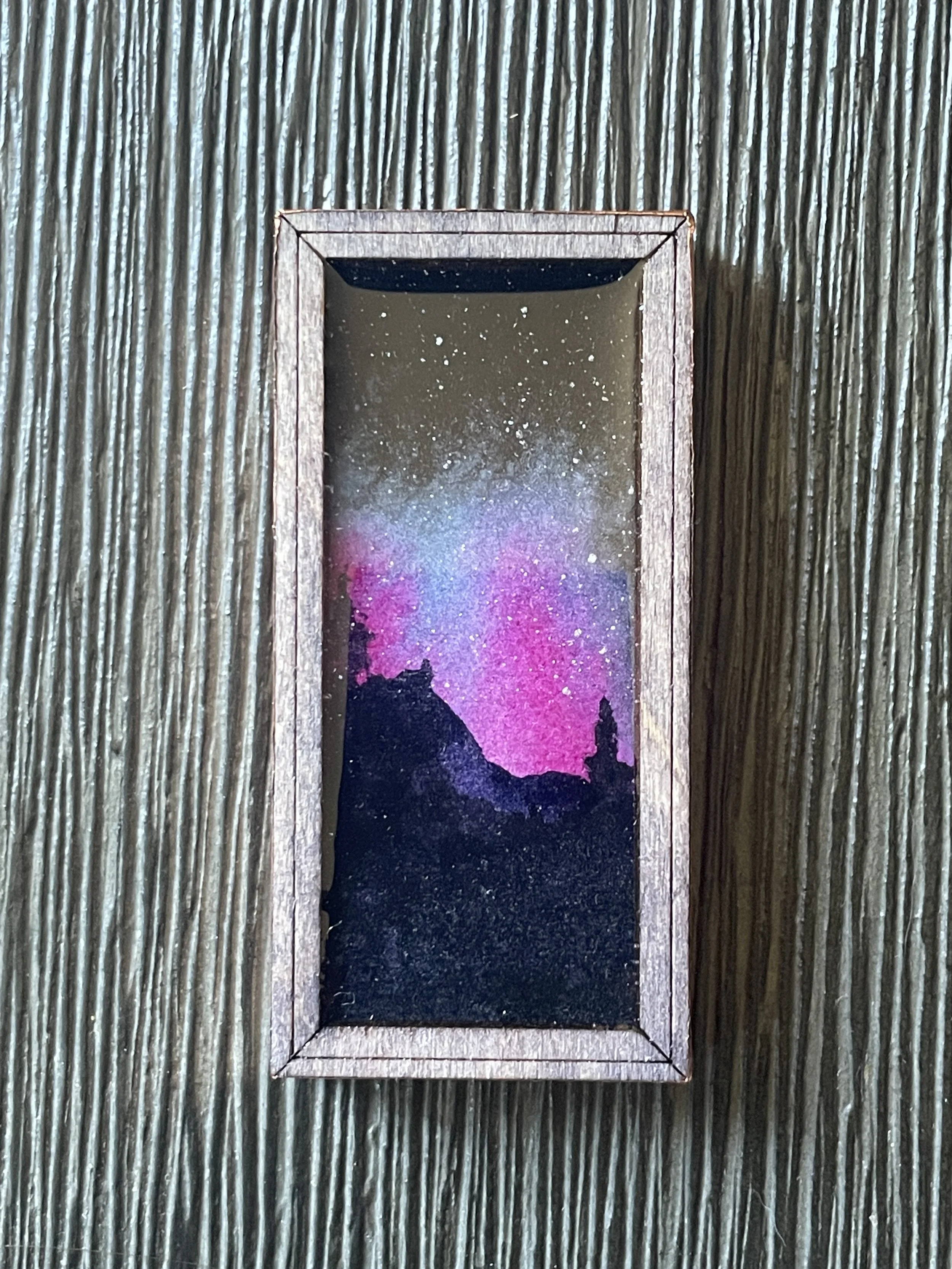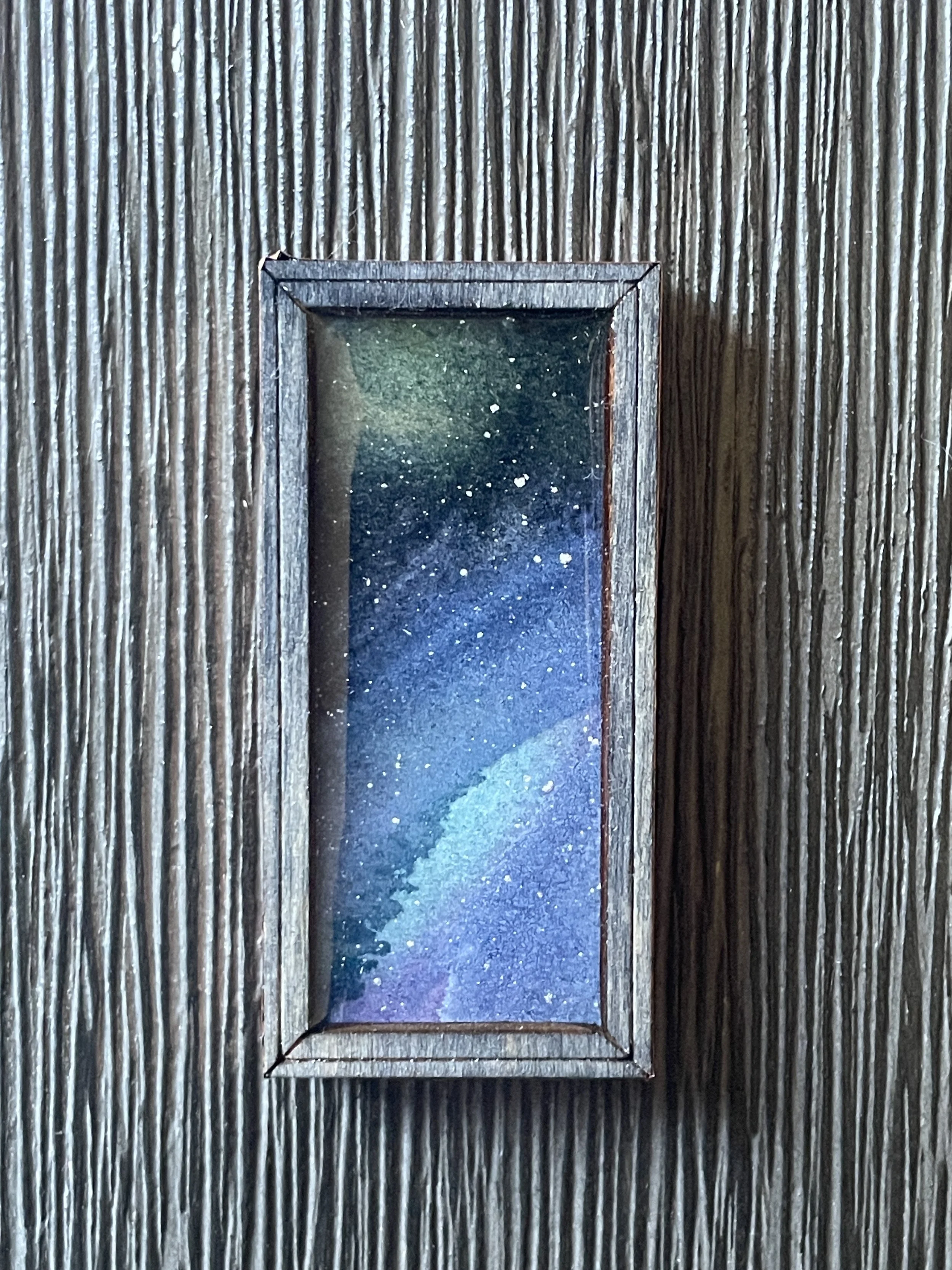 Birds soar through amber clouds and golden sun rays. Watercolor on paper and birch panel. 6×12”