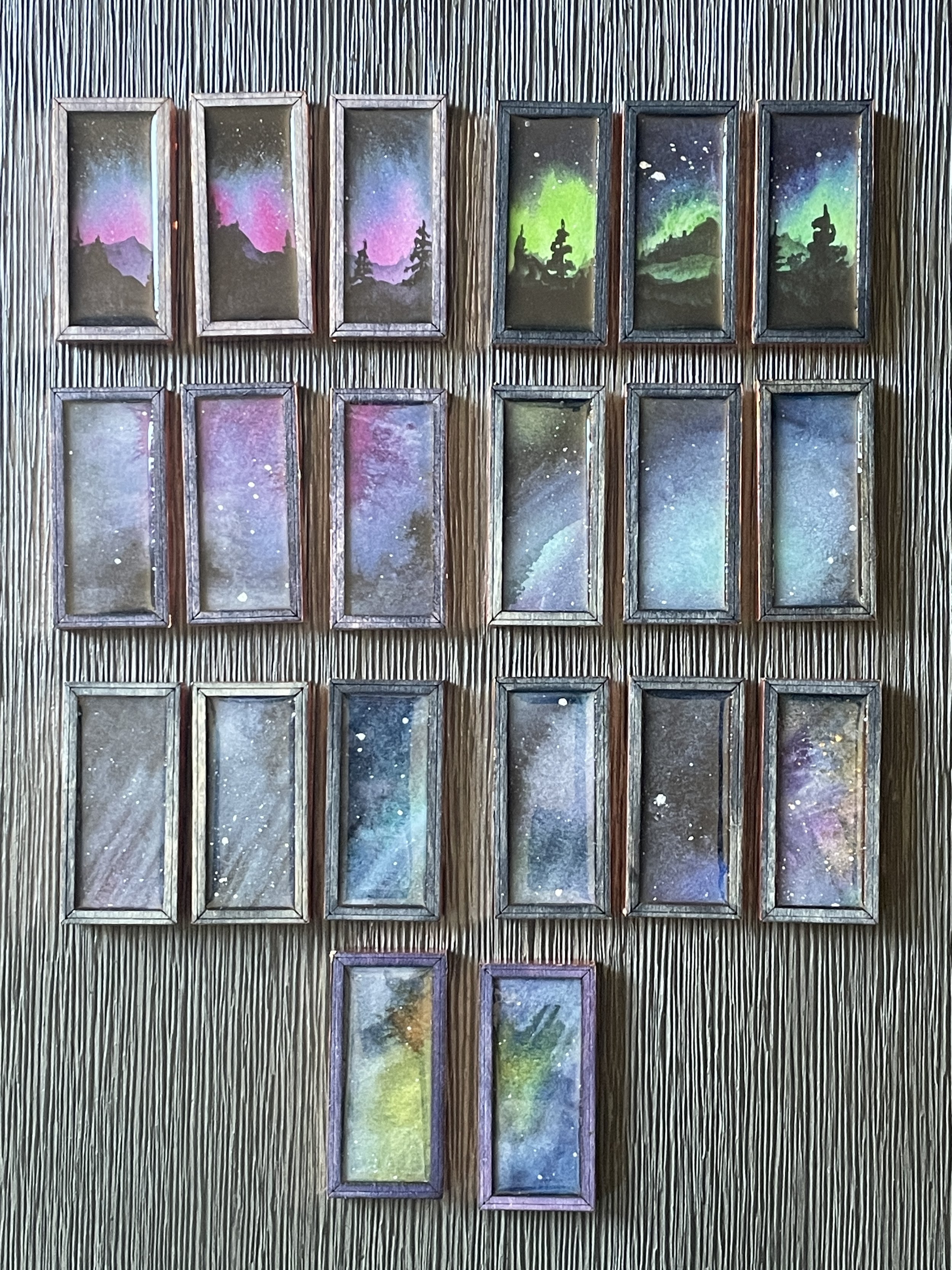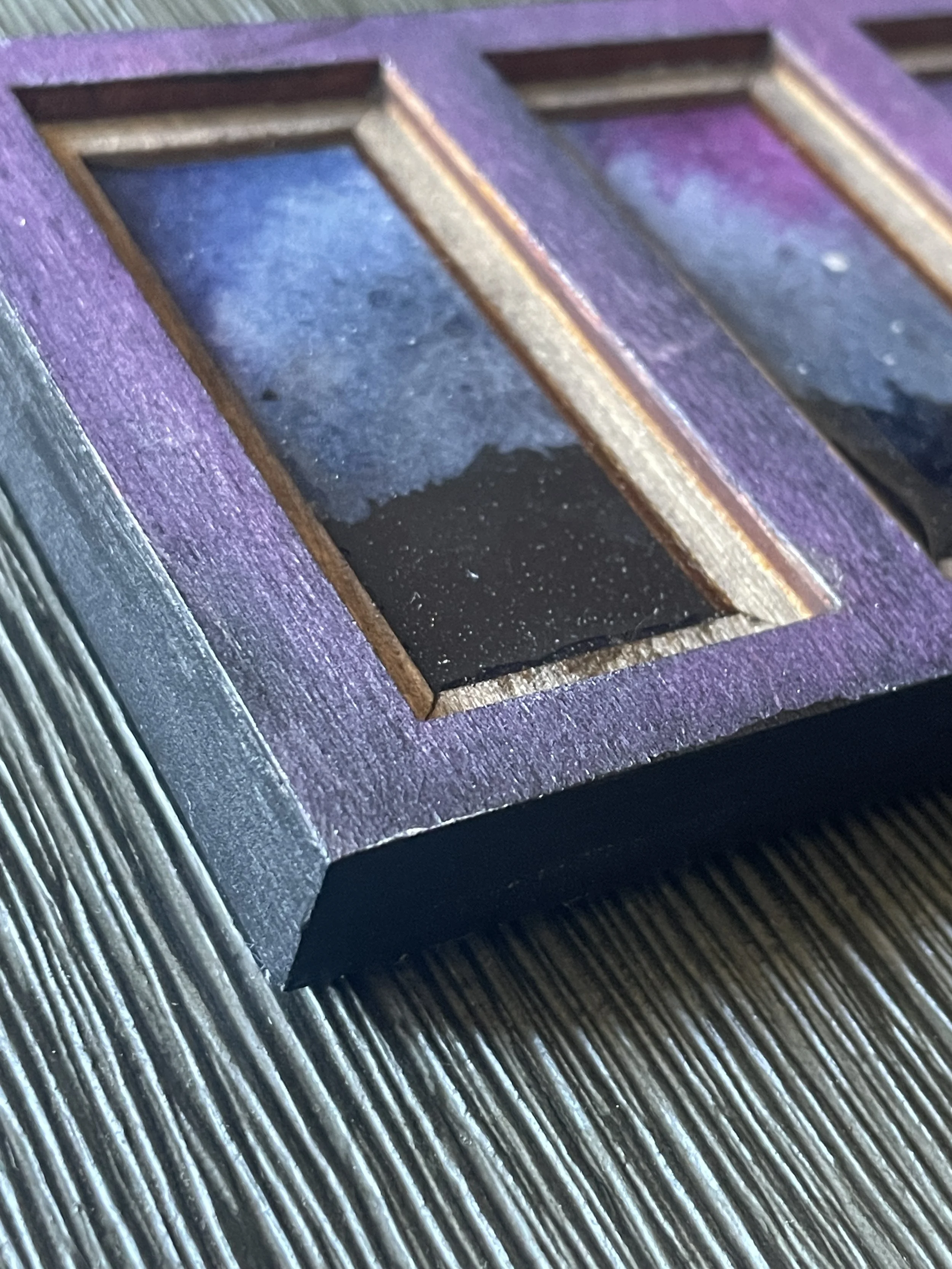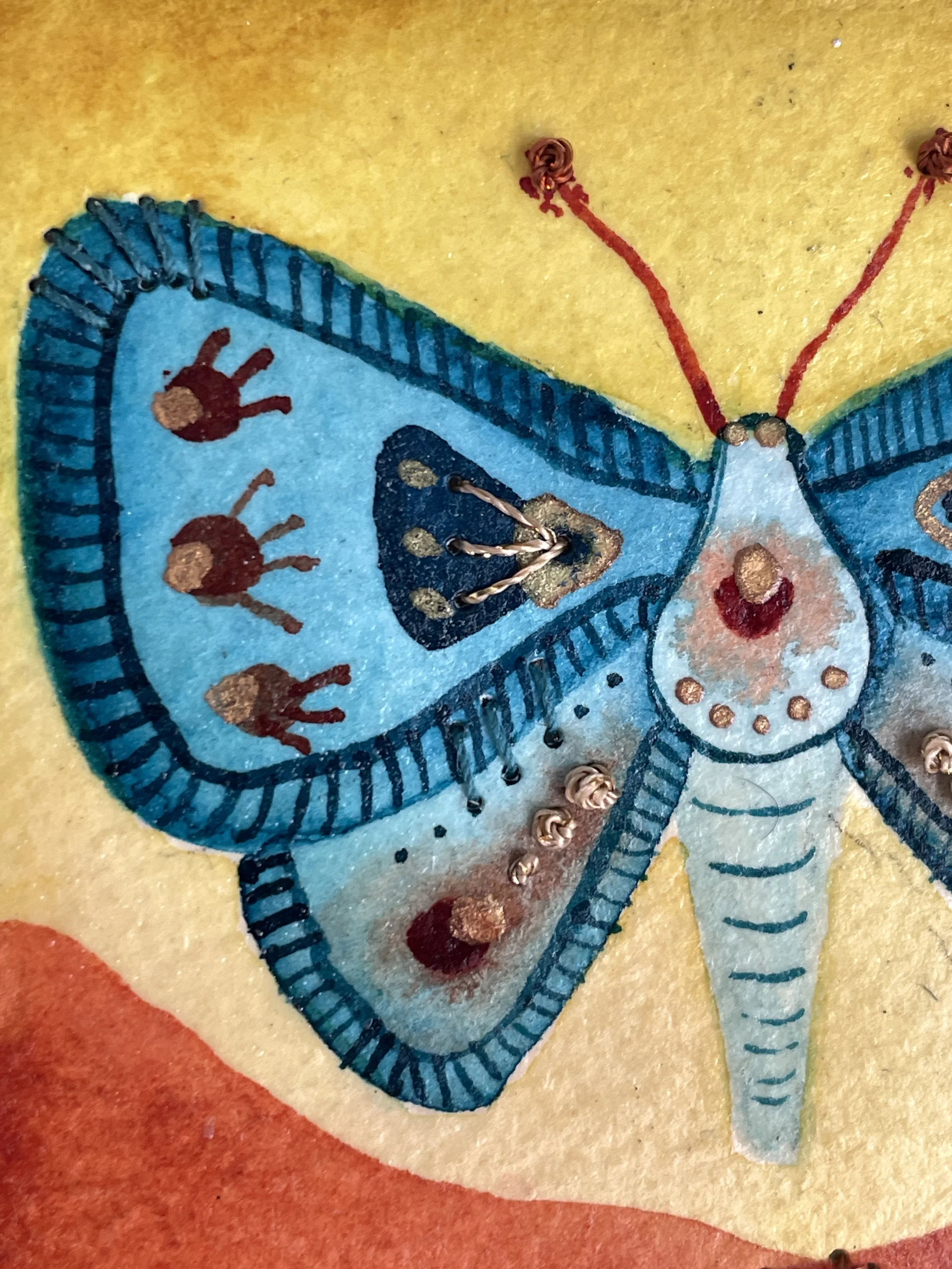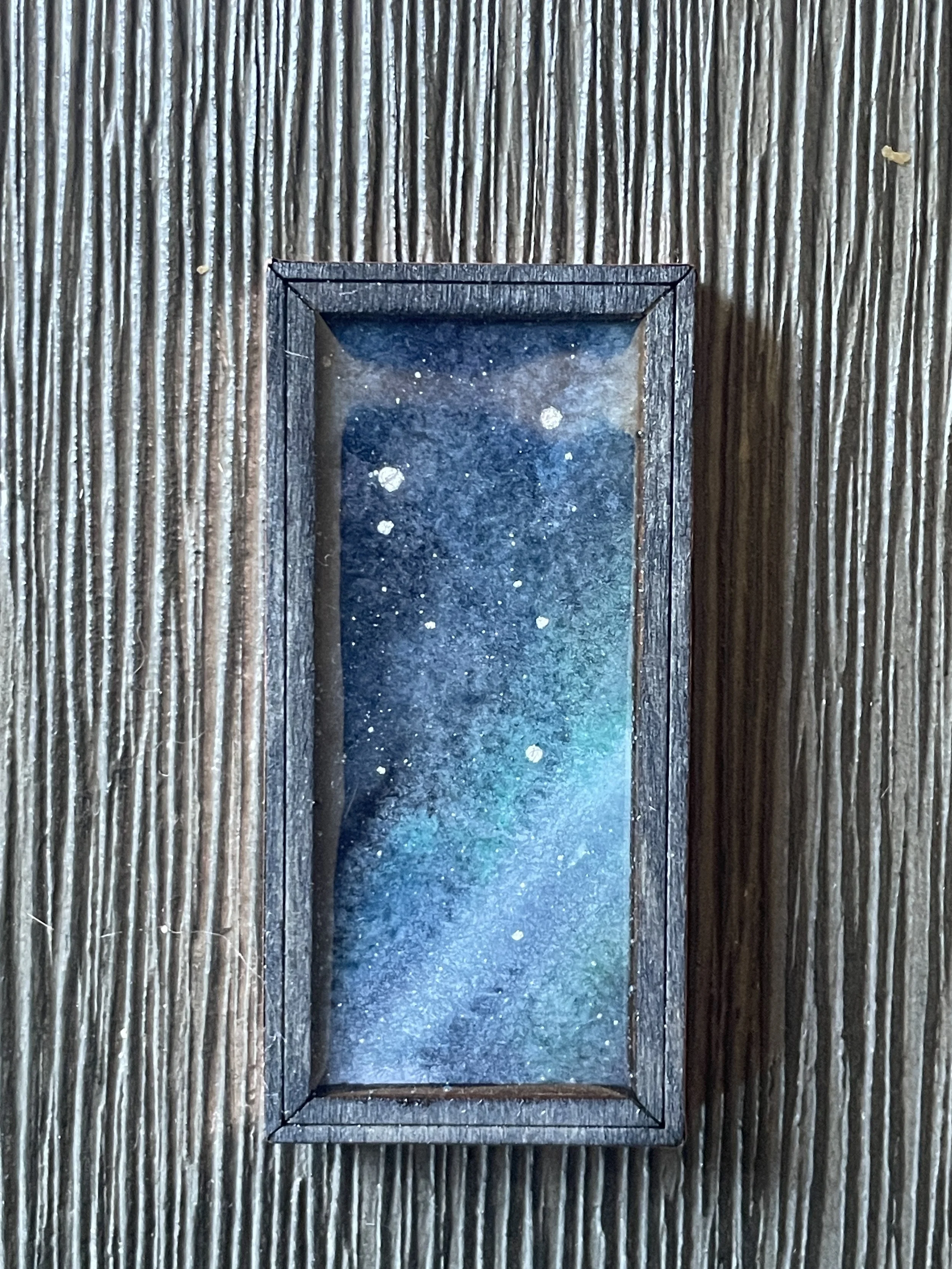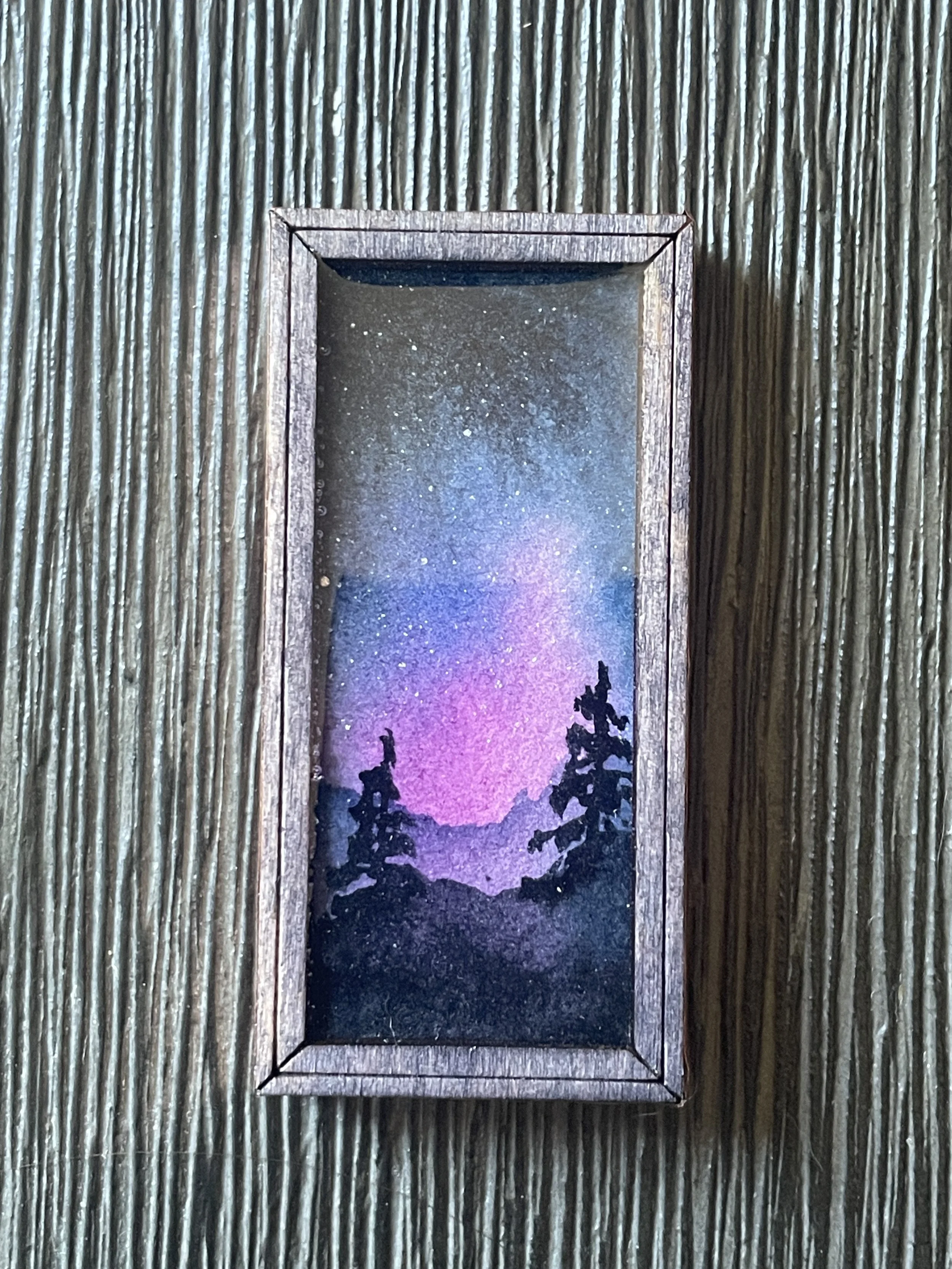 Birds soar through amber clouds and golden sun rays. Watercolor on paper and birch panel. 6×12”
