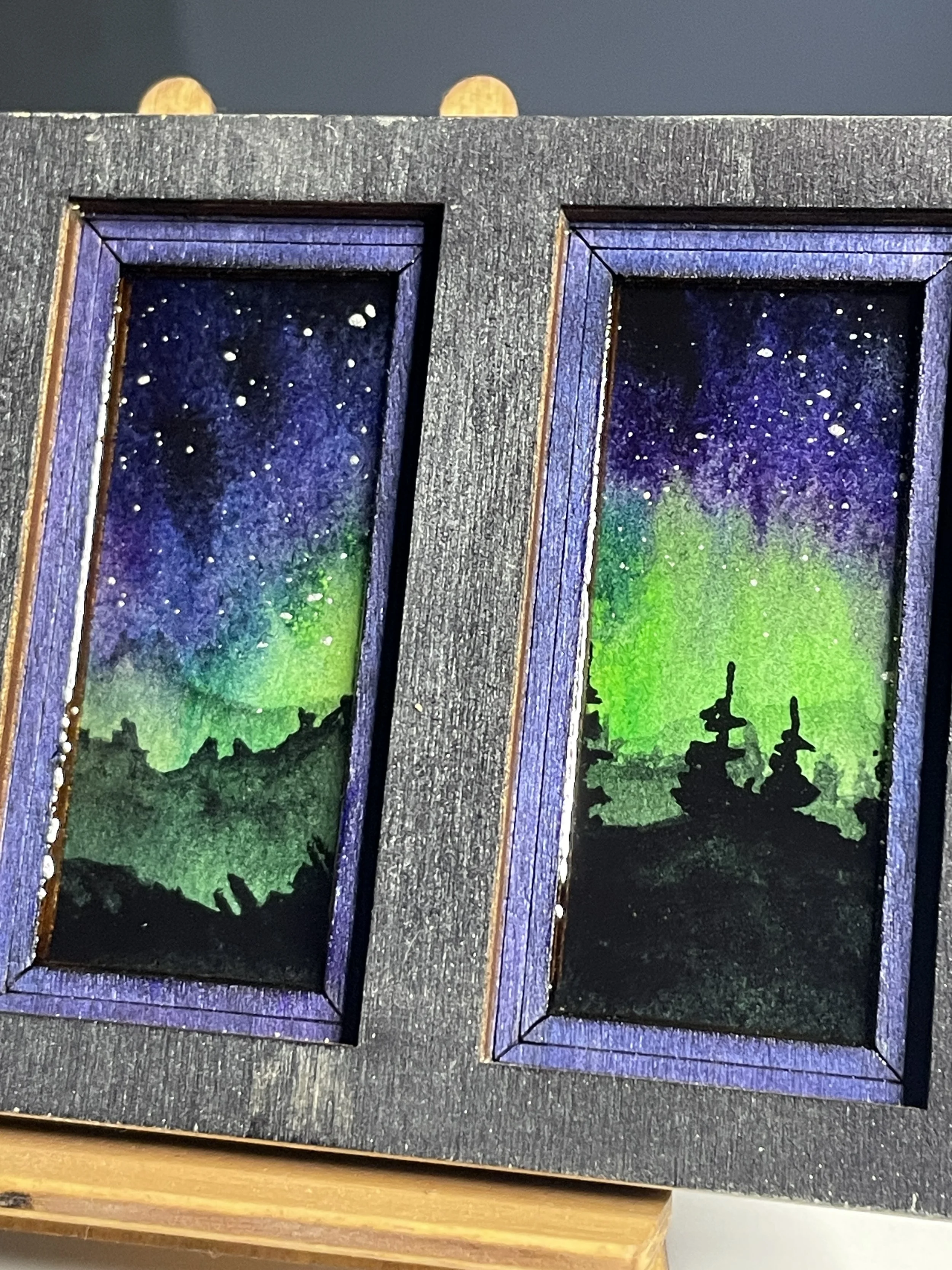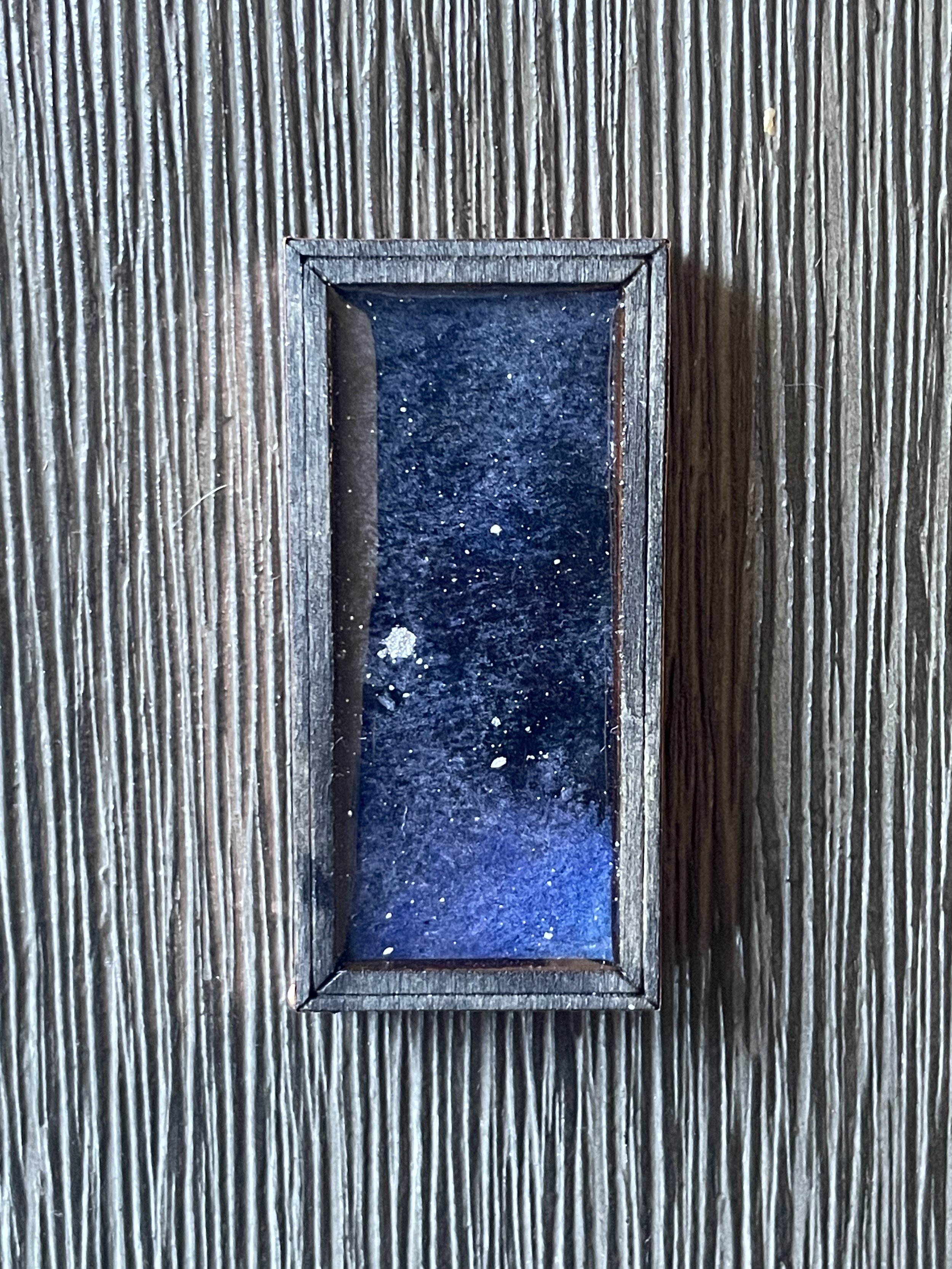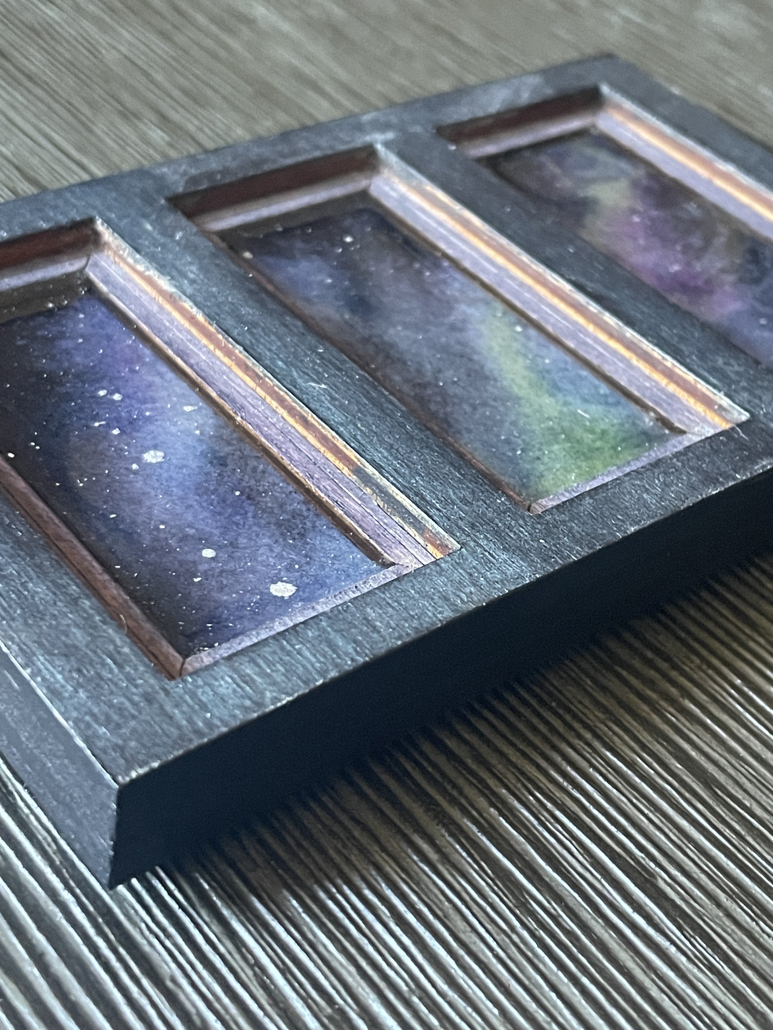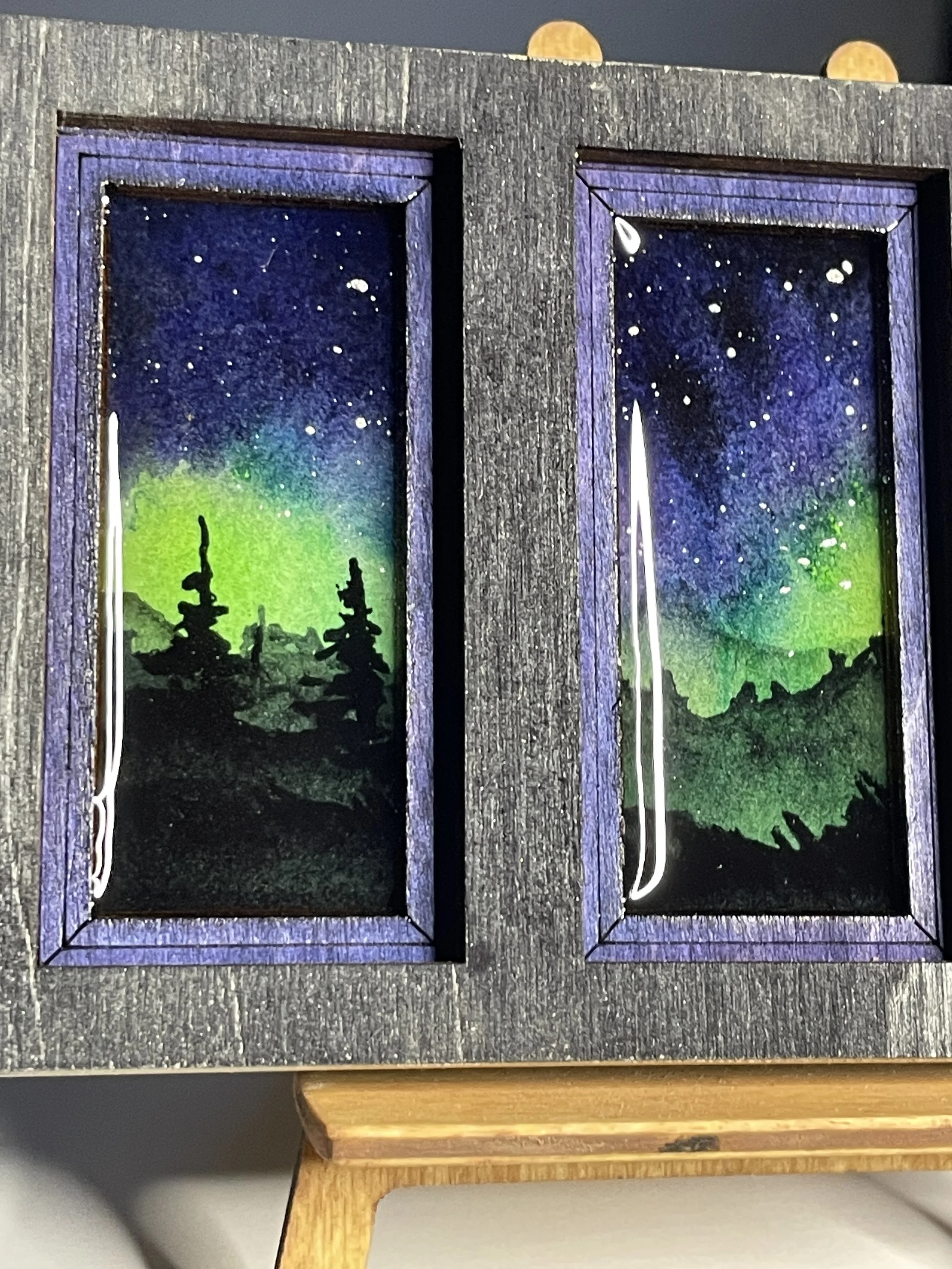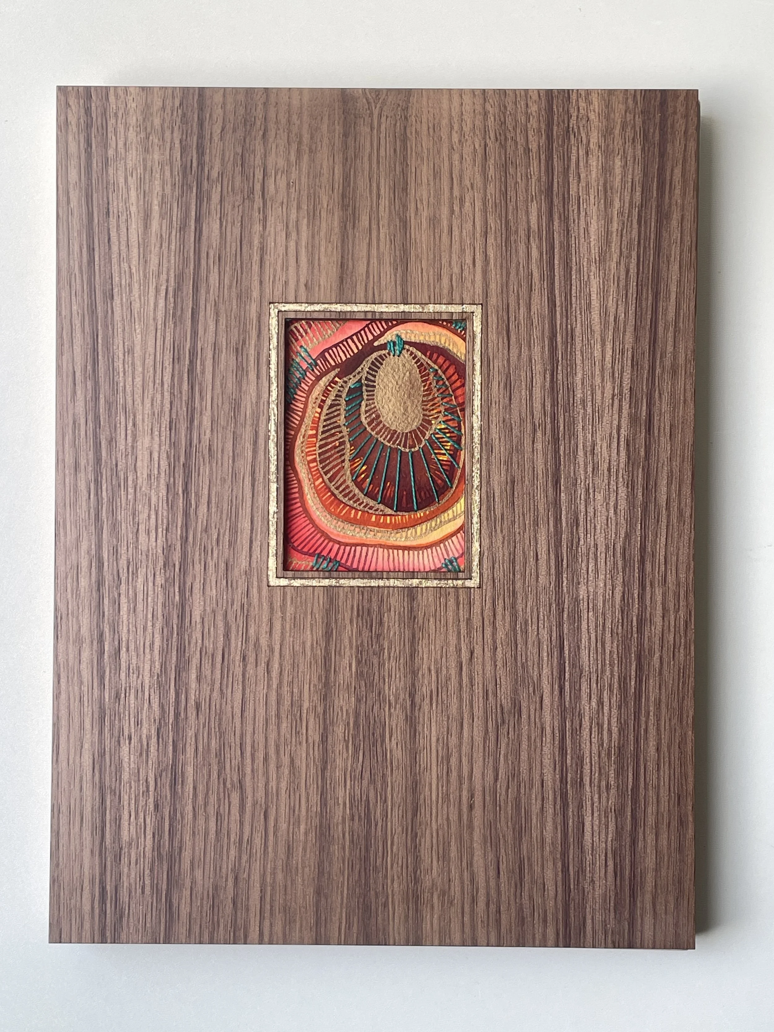 Birds soar through amber clouds and golden sun rays. Watercolor on paper and birch panel. 6×12”