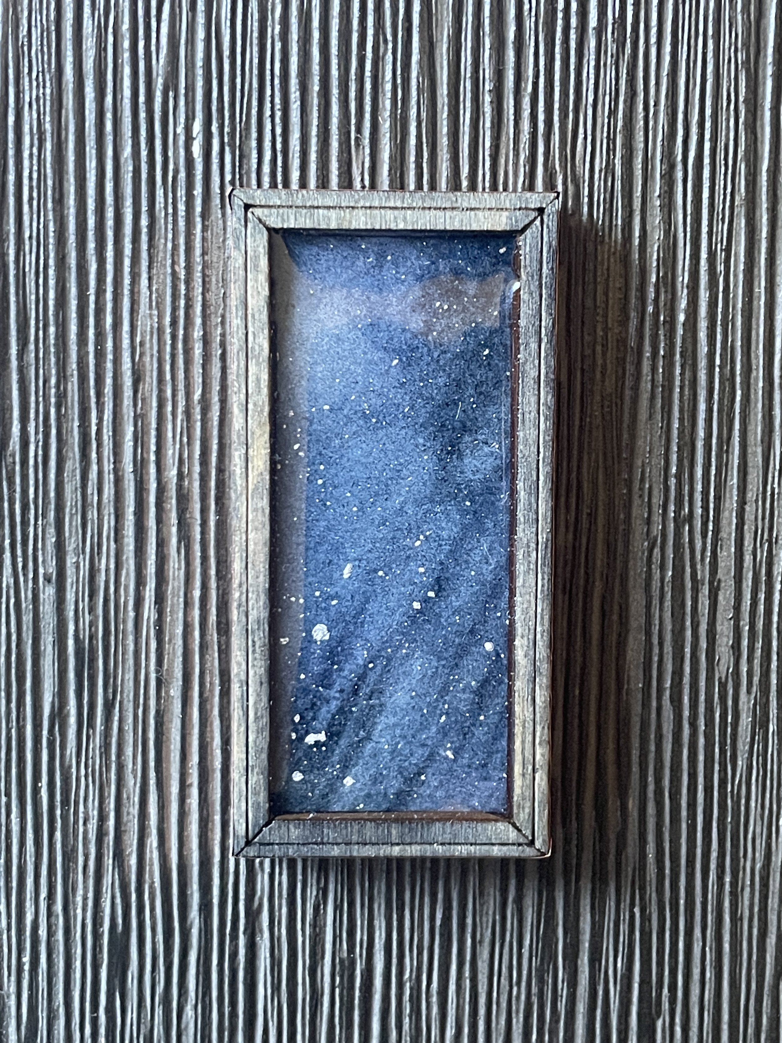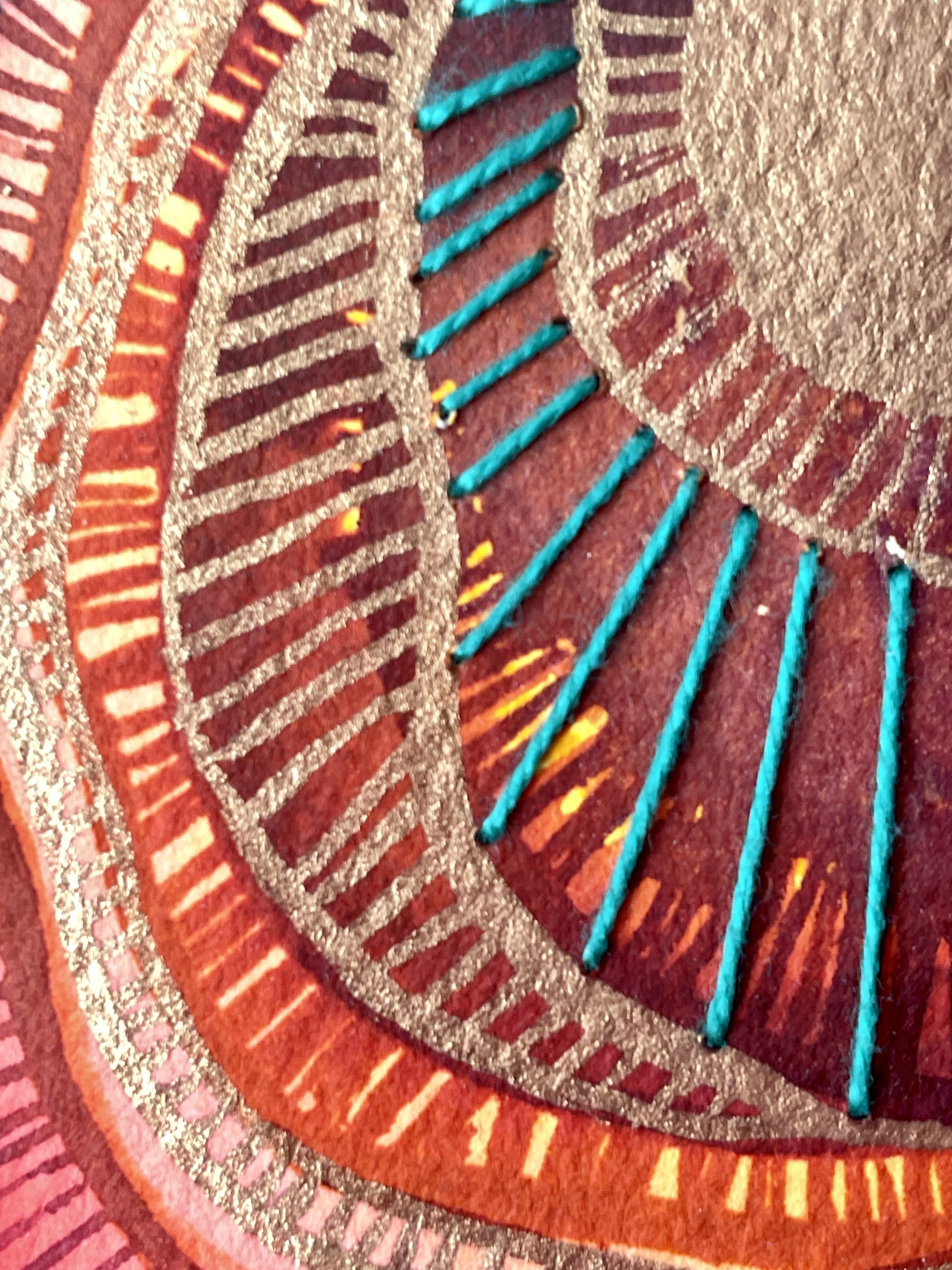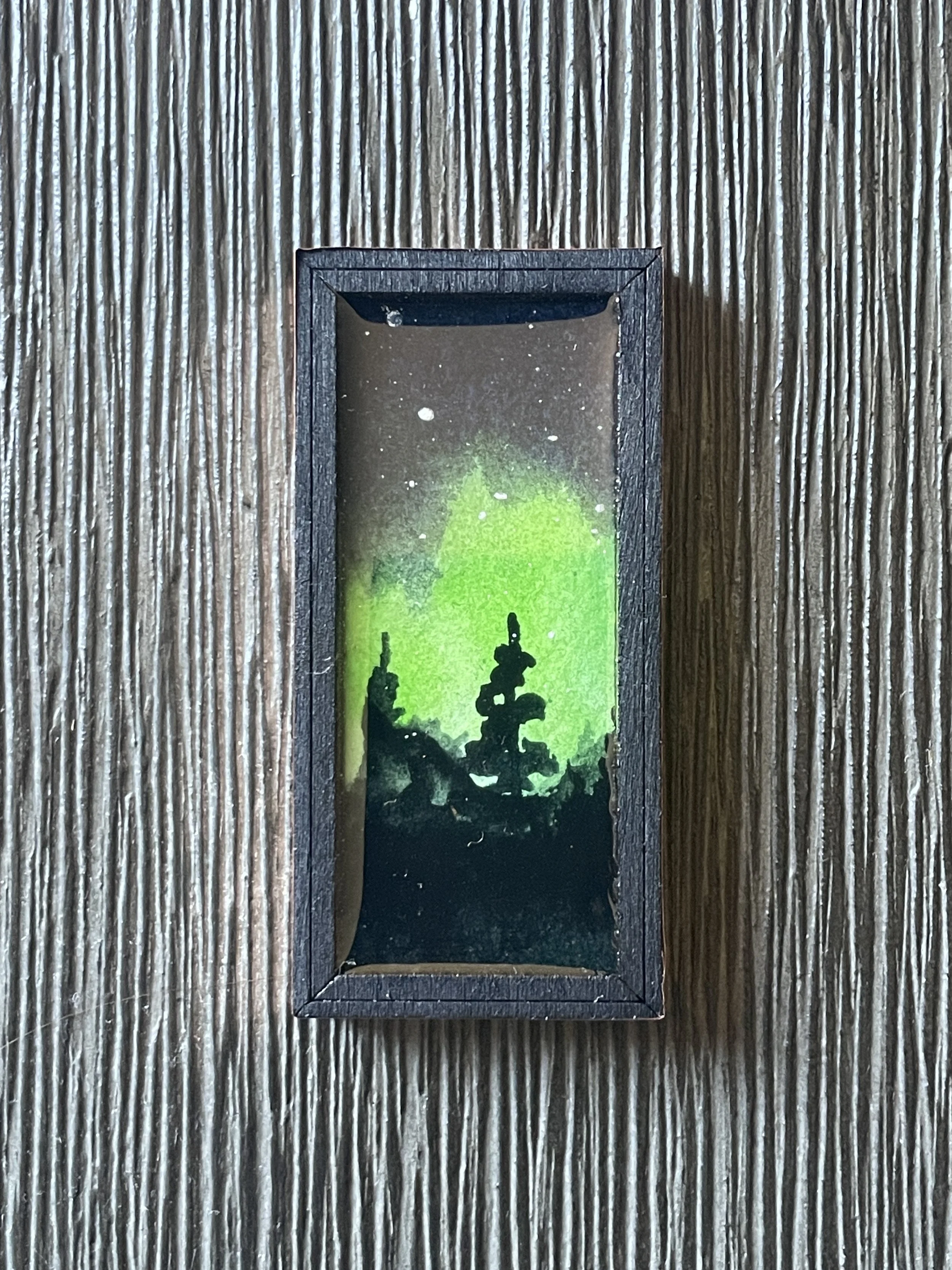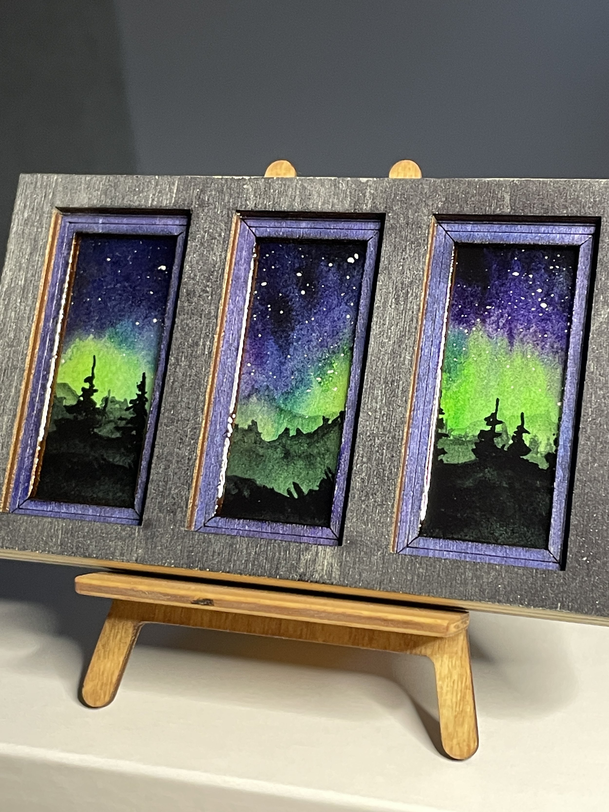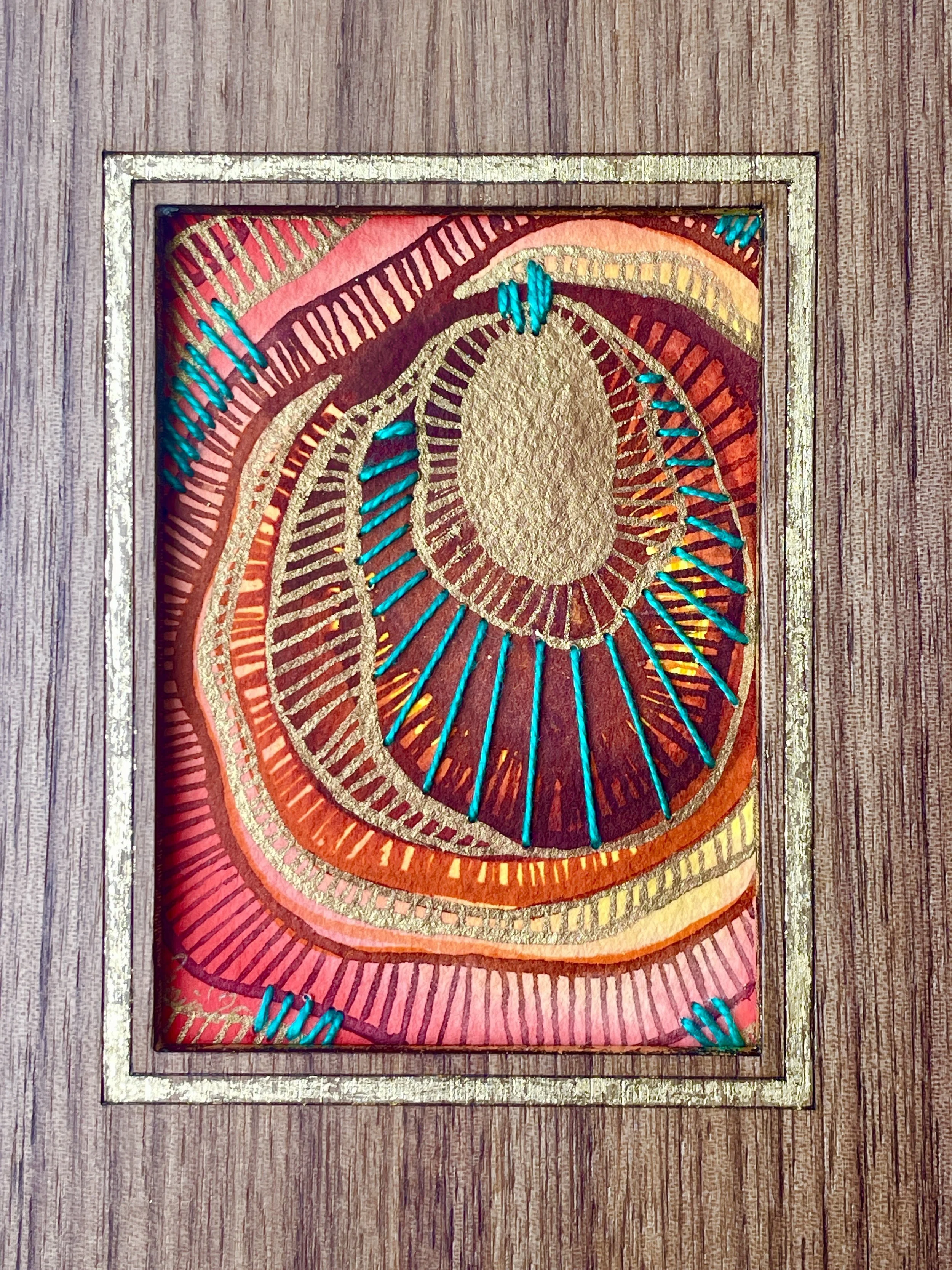Birds soar through amber clouds and golden sun rays. Watercolor on paper and birch panel. 6×12”